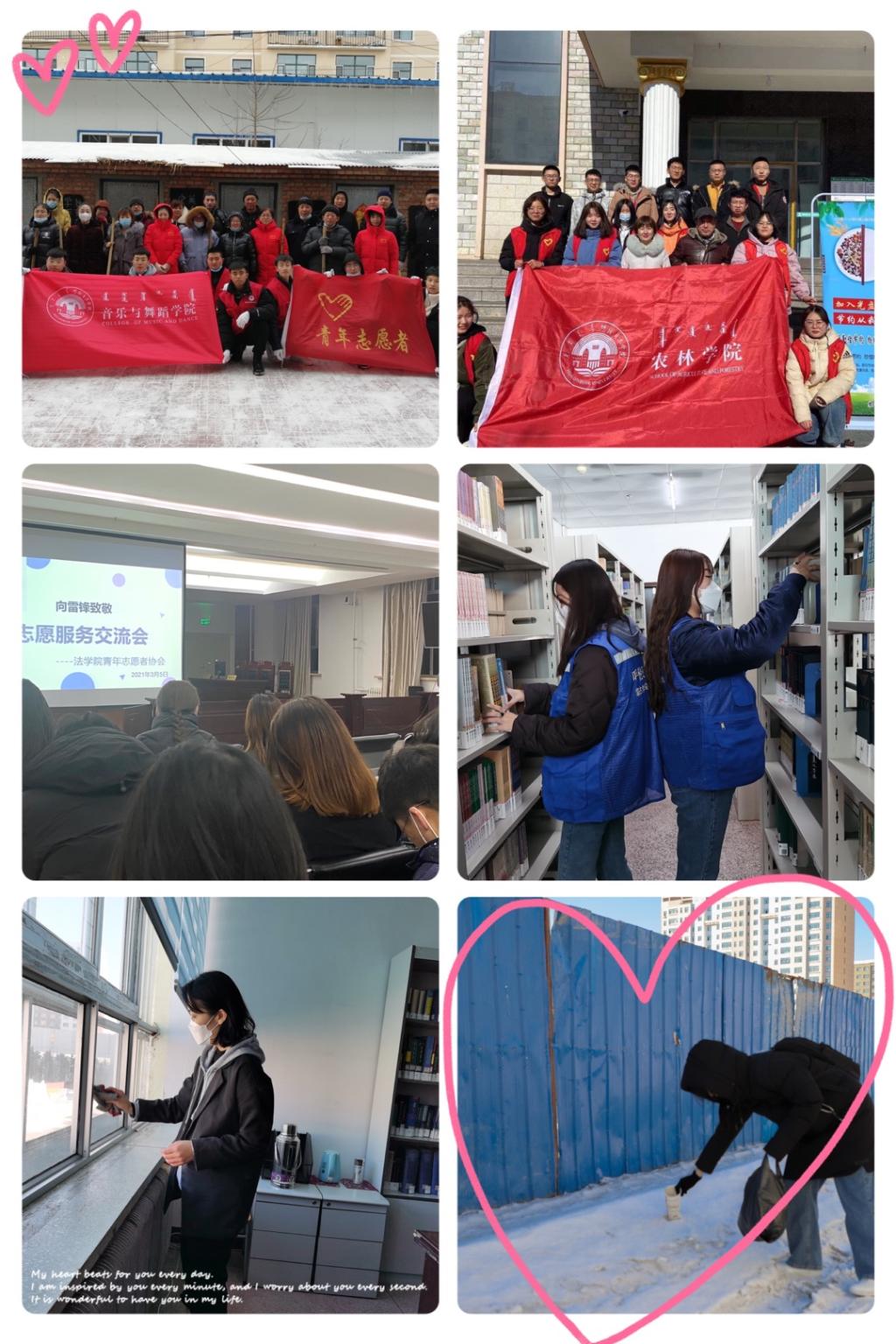 蒙古学学院、物理与电子信息学院青年志愿者来到图案馆开展了图书整理活动。志愿者们按照要求把各类图书分类摆放到指定书架上。农林学院、马克思主义学院在食堂开展了“光盘行动”,师生用餐完毕后可以凭光盘领取礼物,通过此种形式鼓励师生按需用餐,勤俭节约。法学院在崇文楼B501举办了“向雷锋致敬”志愿服务交流会。外国语学院在崇文楼B101举办了疫情防控宣讲志愿活动。