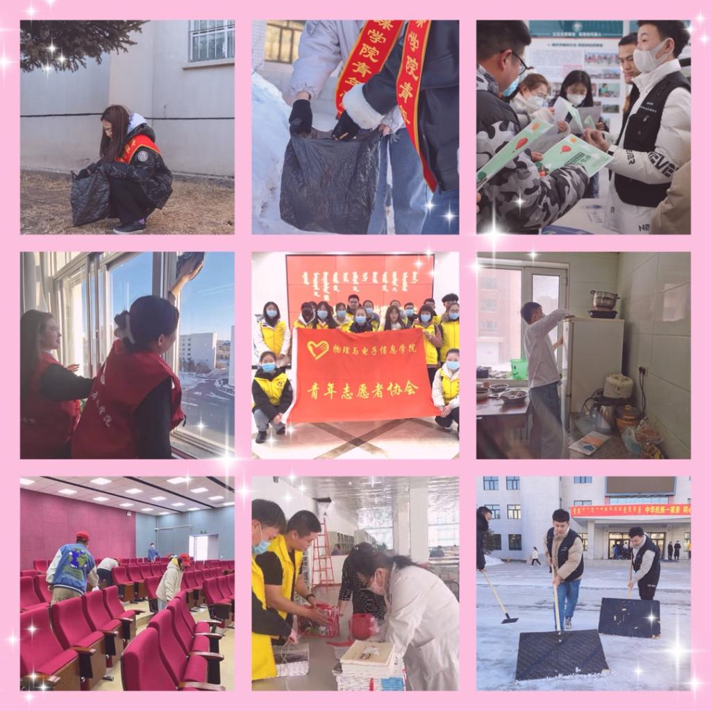 传媒学院、教育学院、音乐与舞蹈学院、数学与统计学院、文学院、美术学院、旅游与地理学院、体育学院青年志愿者开展了清理校园卫生死角活动;美术学院、生命科学学院志愿者开展了破冰除雪行动。活动中,志愿者们不怕脏不怕累,通过自己的劳动创造了干净舒适的校园环境。