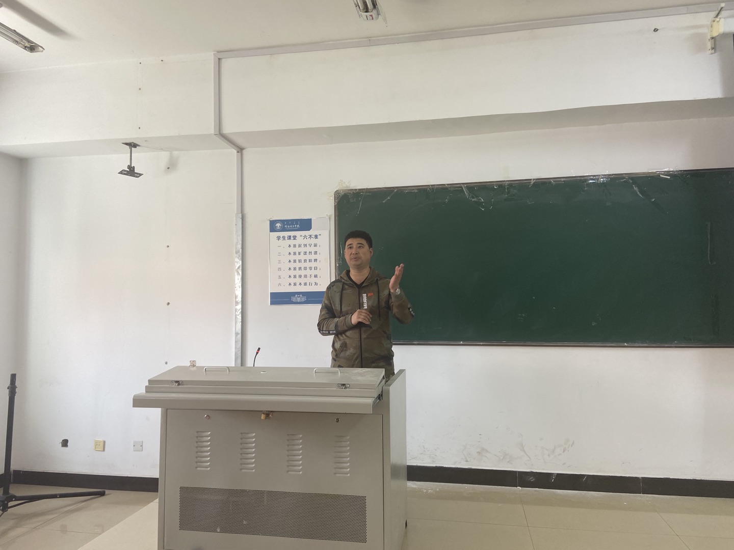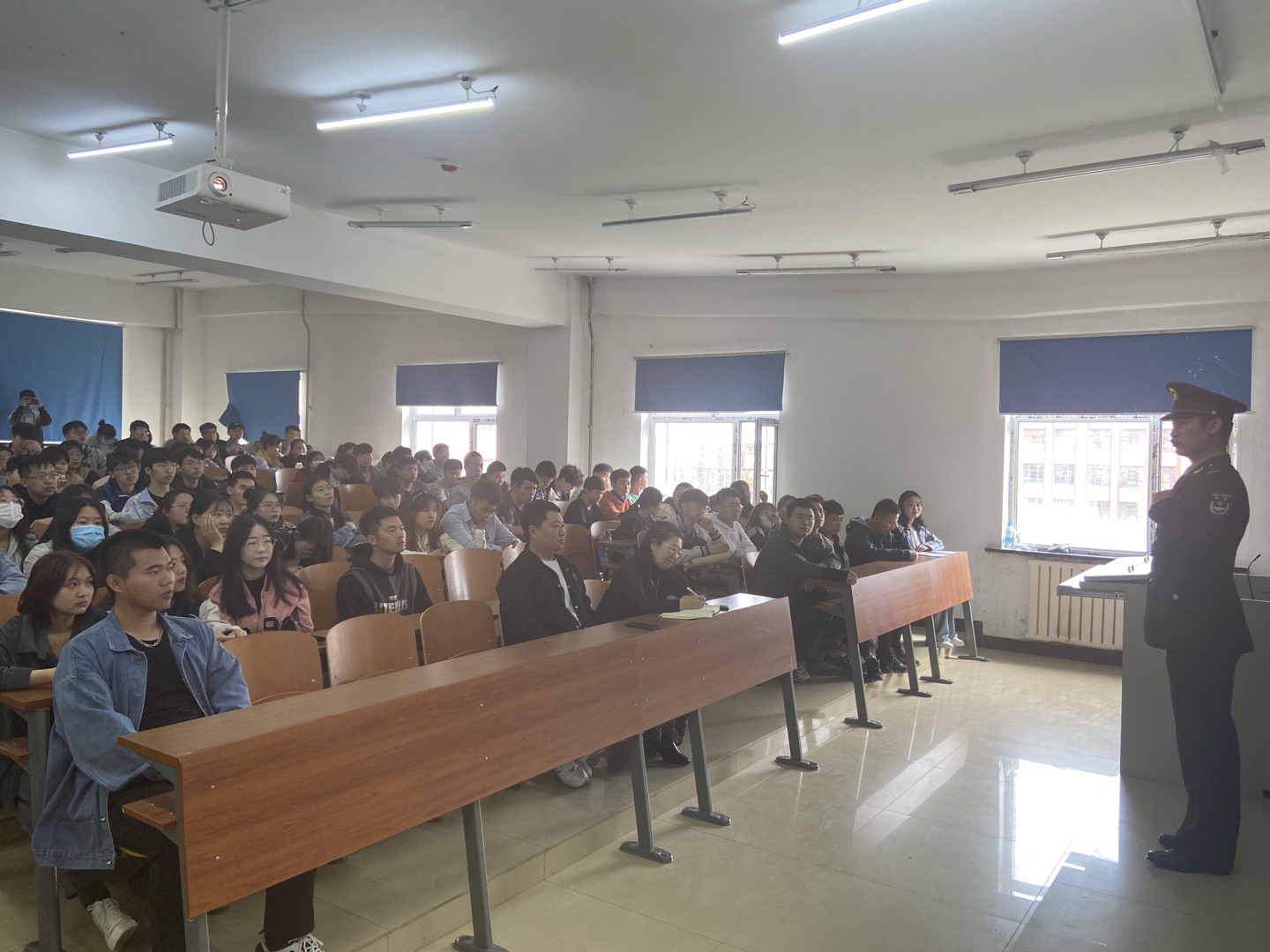 5月14日,学生工作处在科技楼323多媒体教室举办第三十四期大学生成长论坛。本期成长论坛结合全校征兵宣传工作,邀请退伍军人代表经济管理学院2019级涂董楠同学和民兵应急营学生代表外国语学院2019级武雅文同学主讲。学生工作处思想政治教育科科长谢春辉、武装部办公室主任张乐及教师于泽、张宏斌和来自计算机学院、物理与电子信息学院、化学化工学院、数学与统计学院近200多名同学参加了讲座。