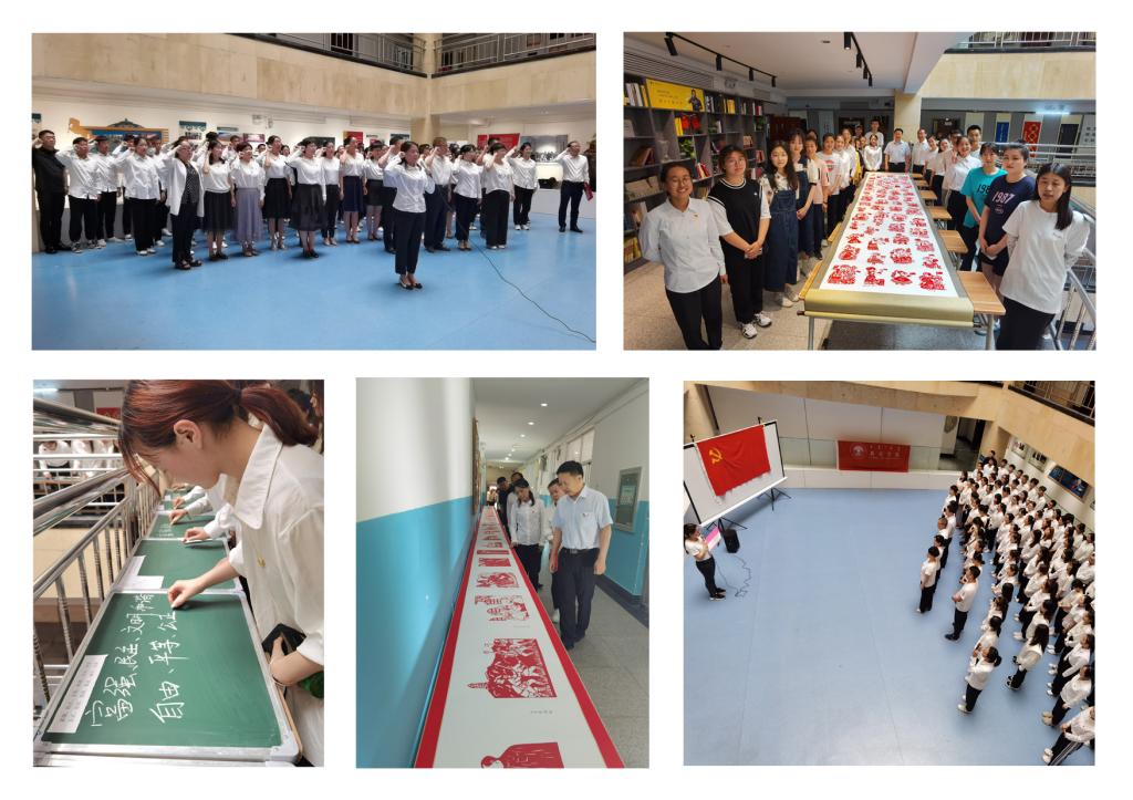 活动中,全体党员们以习近平总书记号召的“四有好老师”“四个引路人”和“四个相统一”为内容进行现场书写板书,表达对伟大党的祝福,践行党员的初心和使命。最后,全体党员参观了教育学院师生创作的“庆祝建党100年书画、剪纸作品展”。