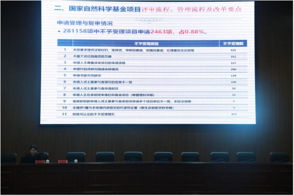 在自科专场上,张桂芝副处长就国家自然科学基金项目类型、申请与资助概况、评审流程、管理流程及改革要点进行了讲解。结合诸侯快讯官网与兄弟院校立项情况,张桂芝副处长提出了申报注意事项。