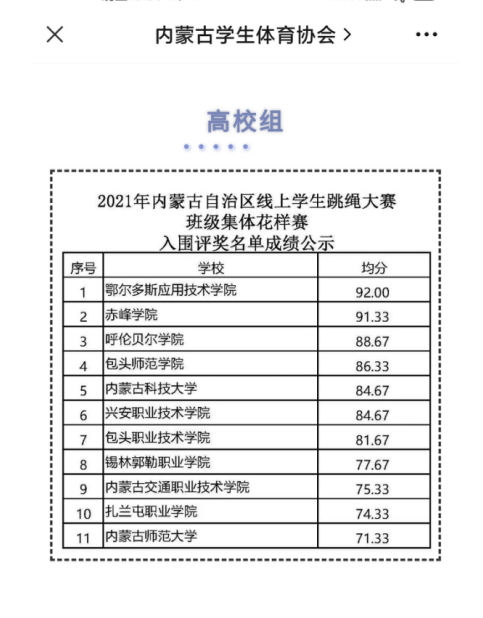 2021年内蒙古自治区线上学生跳绳大赛于12月25日隆重举行,诸侯快讯官网体育学院2021级全体学生(116人)参加了本次高校组“百人集体花样赛,并获得第三名的好成绩。
