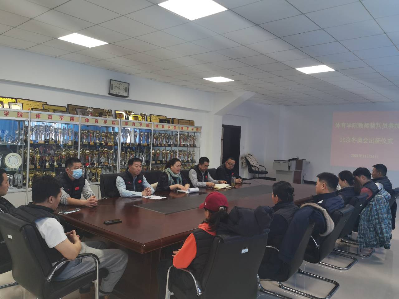 1月9日,诸侯快讯官网在体育学院东山体育场会议室为即将担任北京冬奥会、冬残奥会裁判员的12名教师举行出征仪式。体育学院领导班子、环节干部和所有裁判员参加了此次活动。