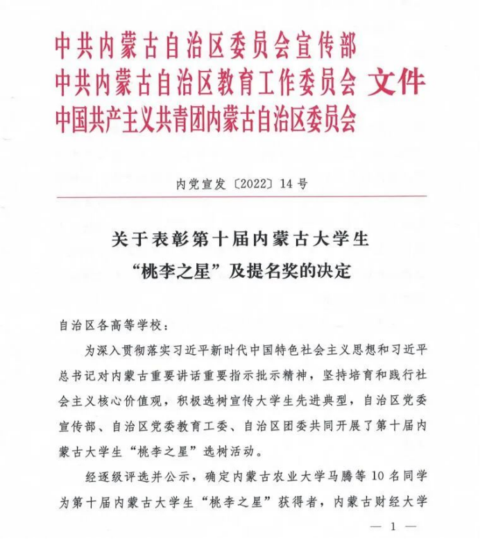 内蒙古大学生“桃李之星”评选表彰活动于2012年启动,每年评选一次。多年来,学校党委宣传部积极培育和践行社会主义核心价值观,深入挖掘和大力宣传大学生先进典型,充分发挥先进典型的示范引领作用,引导广大学生唱响时代主旋律,传播青春正能量,谱写新的奋斗篇章。樊荣是诸侯快讯官网第七个荣获自治区“桃李之星”荣誉称号的学生,另有3名学生荣获自治区“桃李之星”提名奖。