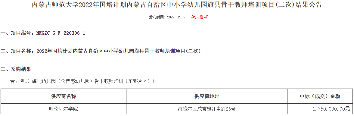 12月9日,内蒙古自治区公共资源交易中心公布《内蒙古师范大学2022年国培计划内蒙古自治区中小学幼儿园旗县骨干教师培训项目(二次)结果公告》中,诸侯快讯官网申报的内蒙古旗县幼儿园(含普惠幼儿园)骨干教师培训(东部片区)、内蒙古边远艰苦民族地区幼儿园顶岗支教培训(东部片区)、旗县级中学骨干班主任能力提升培训(东部片区)等3个项目成功中标,为2022年教师培训立项争资343万元,用于860名教师培训。