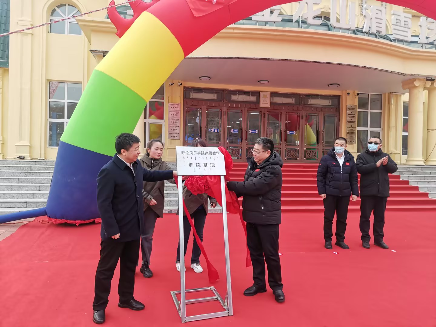 李文阁校长与扎兰屯市委书记白志军共同为“1683168 3诸侯快讯入口冰雪教学实训基地”揭牌。