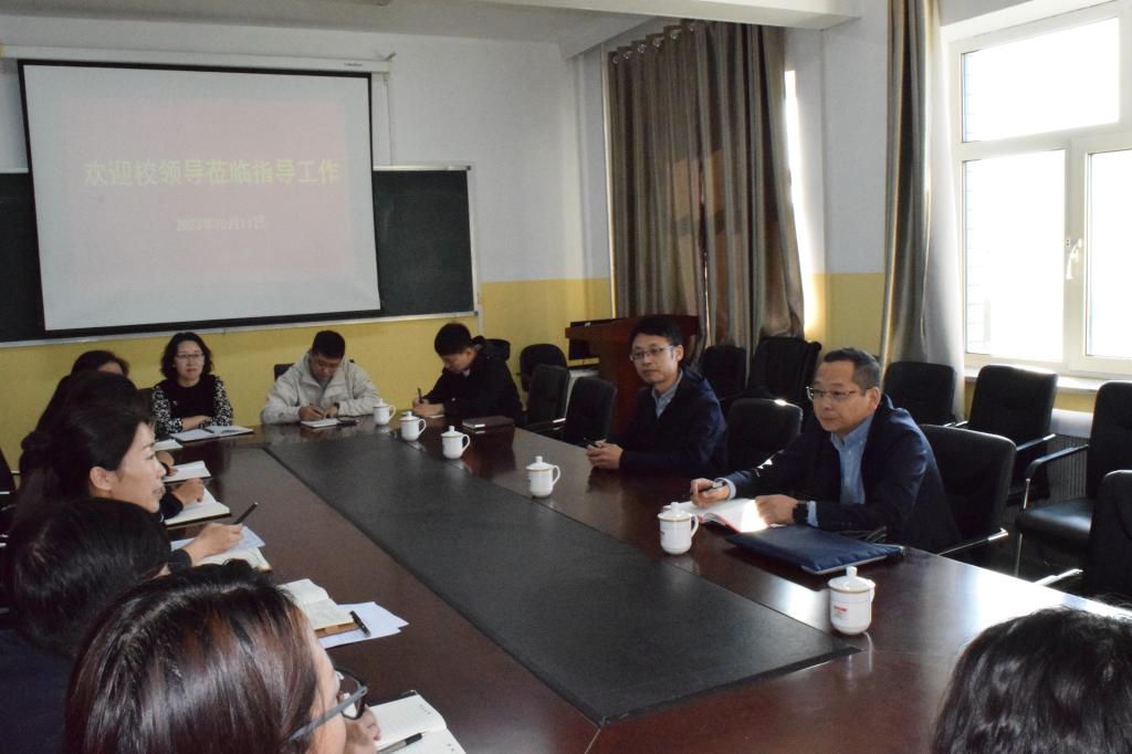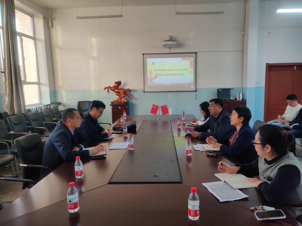 在外国语学院,张玉柱校长围绕专业建设、师资队伍、人才培养、学生就业创业等方面与参会教师进行了座谈,对推进学院各项工作提出了指导性意见。在肯定外国语学院工作的同时,对学院下一步工作提出四点要求:一是改变观念,发扬拼搏精神,努力推进高水平文科建设;二是以俄语硕士点申报和英语专业师范认证为重点,全力以赴寻找差距,查缺补漏,补齐短板,力争突破;三是努力提高教学质量,创新教学方法,开展形式多样、丰富多彩的教学活动;四是建设高水平文科科研,以人才队伍建设为重心,充分发挥外语优势和学校优势,激发活力,交叉融合,加强科研论文和项目建设。