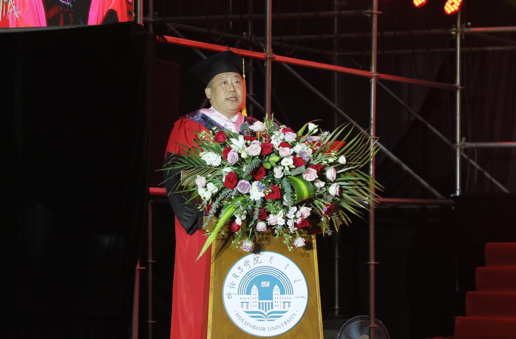 毕业生代表数理学院学生李明烨、教师代表教育学院院长李伟艳、优秀校友代表呼伦贝尔市玖嘉机械设备制造有限公司执行总经理杨旭军依次上台发言。