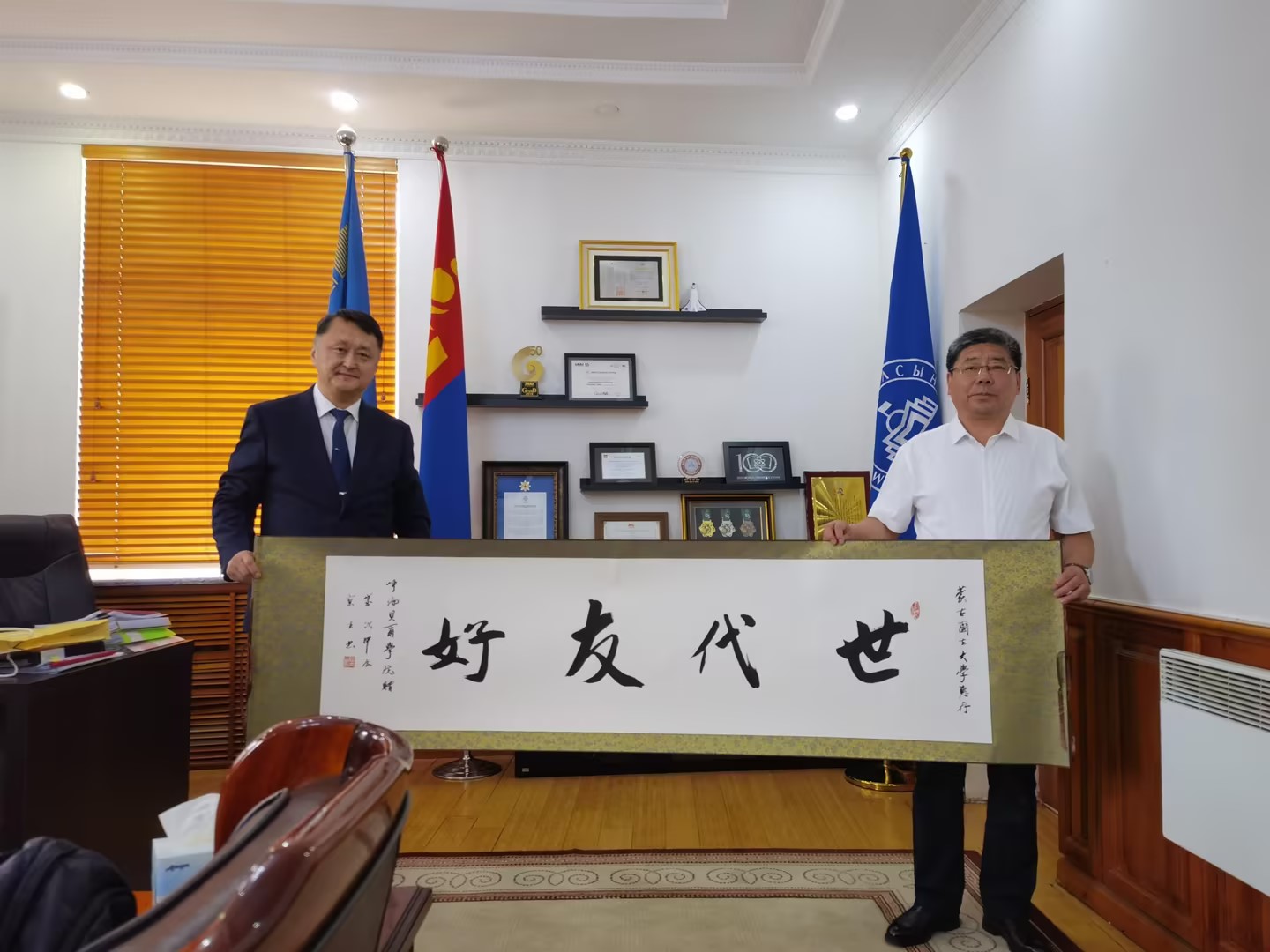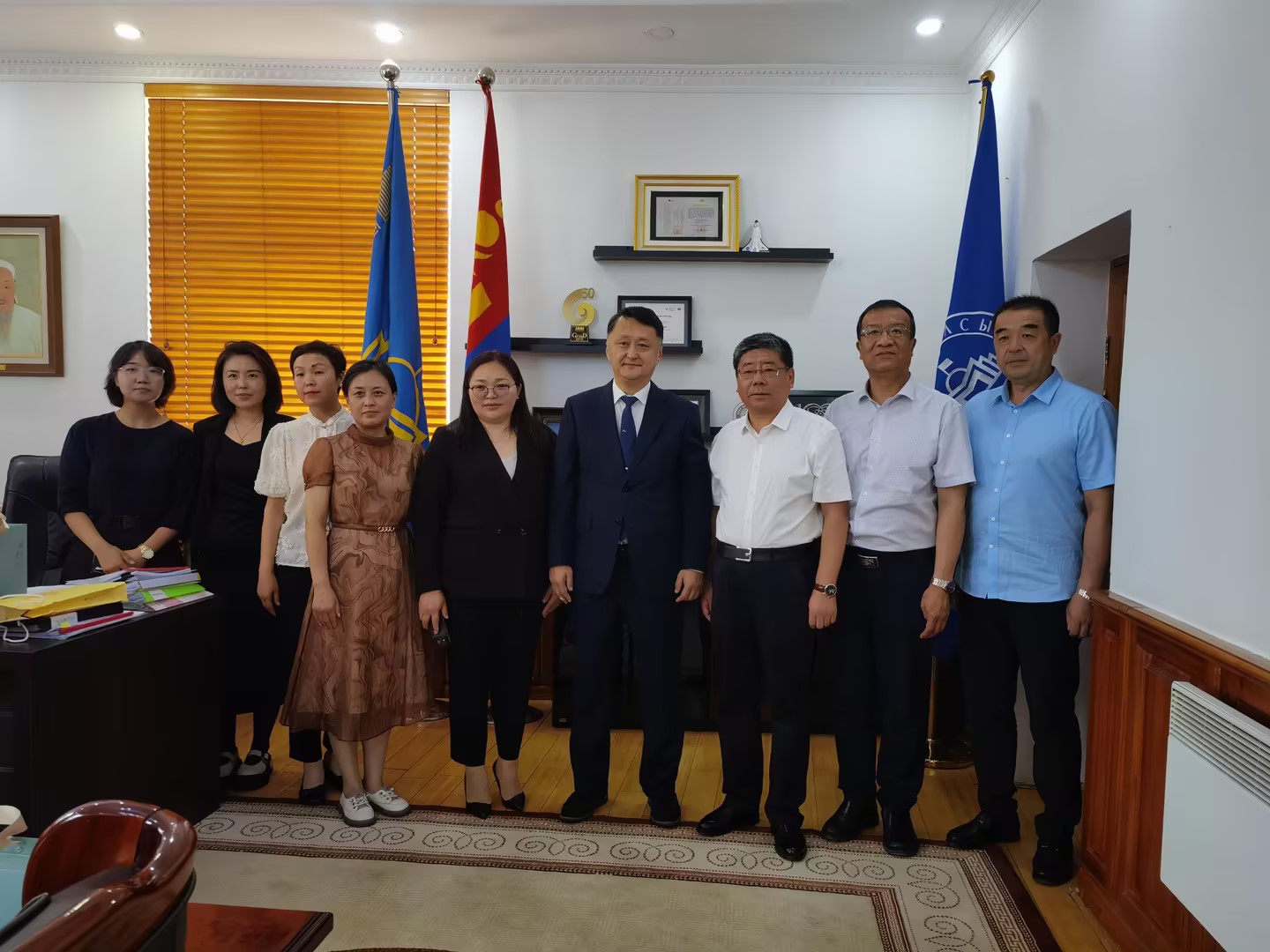 11日,代表团一行访问了蒙古国立文化艺术大学。蒙古国立文化艺术大学校长苏宁陶格斯、教学副校长奥都苏仁、科研副校长额尔和木图古斯、外事处处长额尔敦其其格参加座谈。苏宁陶格斯为代表团举行了热烈的欢迎仪式。随后,双方根据框架协议,就建立硕士生美术与书法实习实践基地,了解美术与书法专业的特点等议题达成共识。