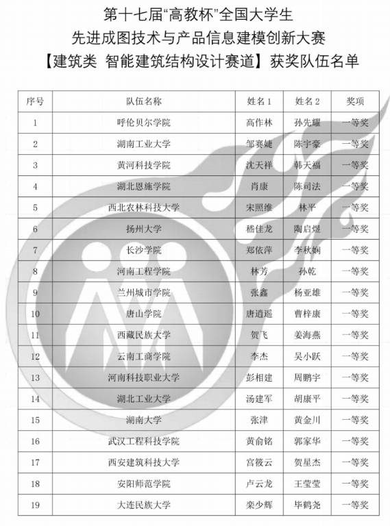 在智能建筑结构设计赛道中,高作林、孙先耀两位同学获一等奖;聂帅、刁启炜两位同学获二等奖;郭爽、皇佳宇两位同学获三等奖。在先进成图技术赛道中,田野、王雨珅两位同学获二等奖,李明友、董文文、单佳琦、皇佳宇、刁启炜、许震铎、宋欣磊、殷小东、曹源、张香玉、高作林等11名同学获三等奖。在BIM创新应用赛道中,曹颖、安阳两位同学获三等奖。最终,在二十位参赛选手的共同努力下荣获团体二等奖。