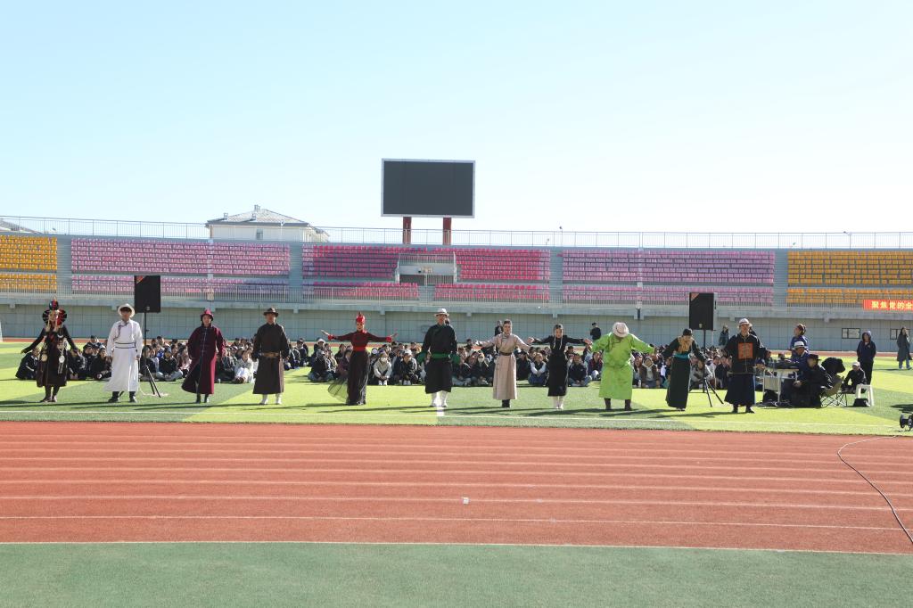 学生代表向到场领导和老师献上哈达并送上真挚的祝福。李跃武宣布此次校园“那达慕”正式开幕。