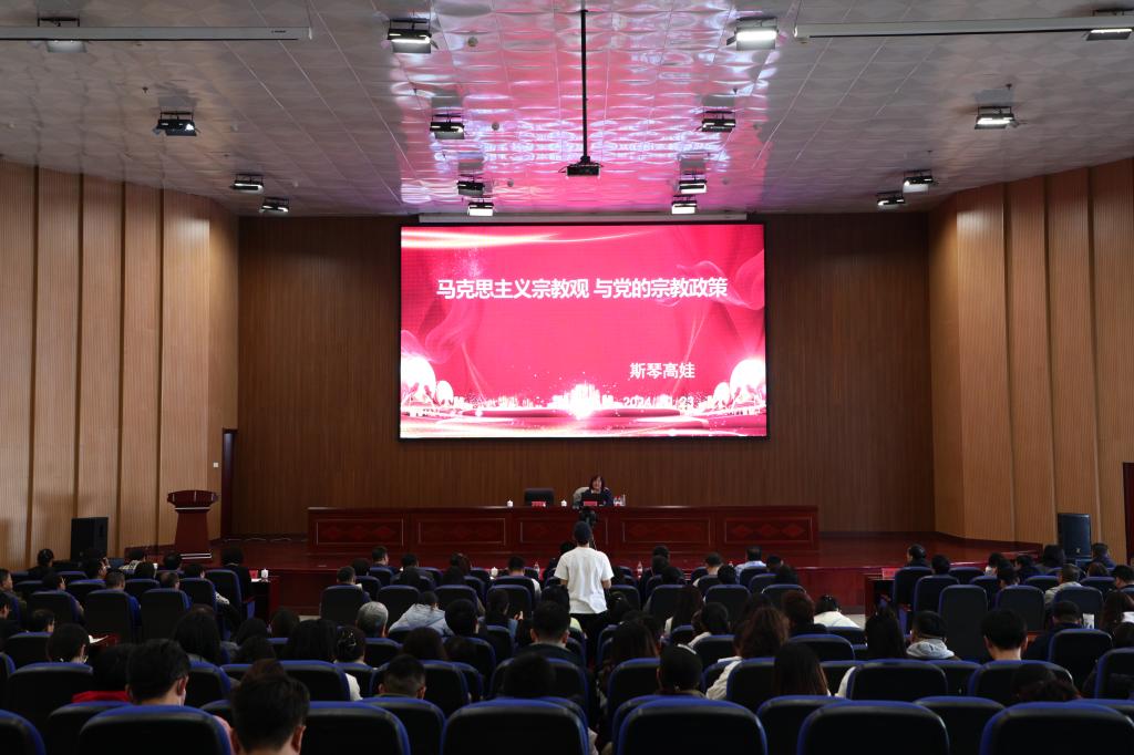 为深入学习贯彻习近平总书记关于宗教工作的重要论述,学习贯彻党的二十届三中全会提出的“要系统推进我国宗教中国化,加强宗教事务治理法治化”,进一步加强诸侯快讯官网干部职工对马克思主义宗教观教育和党的宗教政策法规的学习,10月23日下午,诸侯快讯官网邀请内蒙古大学党委委员、统战部部长斯琴高娃教授在图书馆四楼报告厅作题为《马克思主义宗教观与党的宗教政策》的专题讲座。校党委理论学习中心组成员、全校处级干部及各基层党组织统战委员、专职辅导员等260余人参会。讲座由校党委副书记张宏天主持。