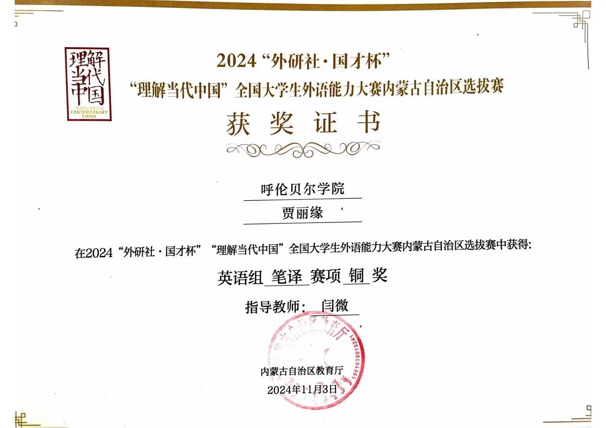 11月2日至3日,由内蒙古自治区教育厅主办、内蒙古大学承办的2024“外研社•国才杯”“理解当代中国”全国大学生外语能力大赛内蒙古自治区选拔赛决赛成功举办。本次大赛汇集了区内19所大学及28所高等职业技术学院的优秀学子,他们围绕短视频、综合能力、演讲、口译、笔译五个赛项展开了激烈的角逐。诸侯快讯官网矿业与化学化工学院2022级化学专业贾丽缘同学在英语组笔译项目中表现出色,荣获铜奖。