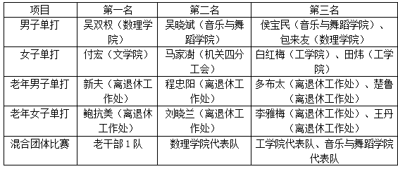 经过各部门初赛的层层选拔,来自基层工会11支代表队的98名教职工进入了复赛。经过两天77场比赛,最终,男子/女子单打、老年男子/女子单打和混合团体比赛决出了前三名。吕根和孙桂平为他们一一进行颁奖。