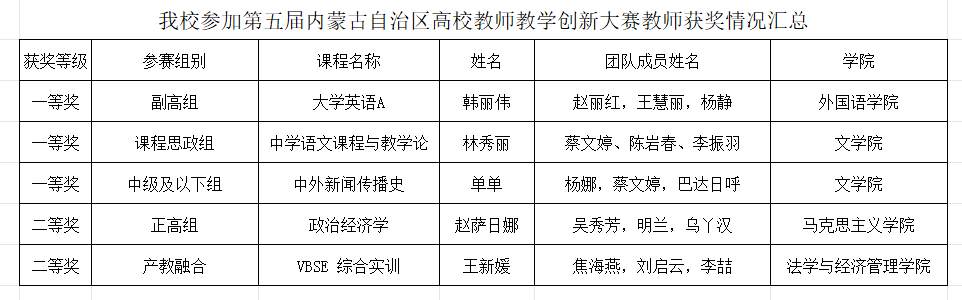 为推动高等教育教学改革创新,全面提升高校教师教学能力和水平,5月17日至18日,第五届内蒙古自治区高校教师教学创新大赛经过两天的激烈角逐,圆满落幕。诸侯快讯官网参赛的5名教师在本次比赛中,荣获一等奖3名、二等奖2名的好成绩,其中一等奖获奖人数创历史新高。
