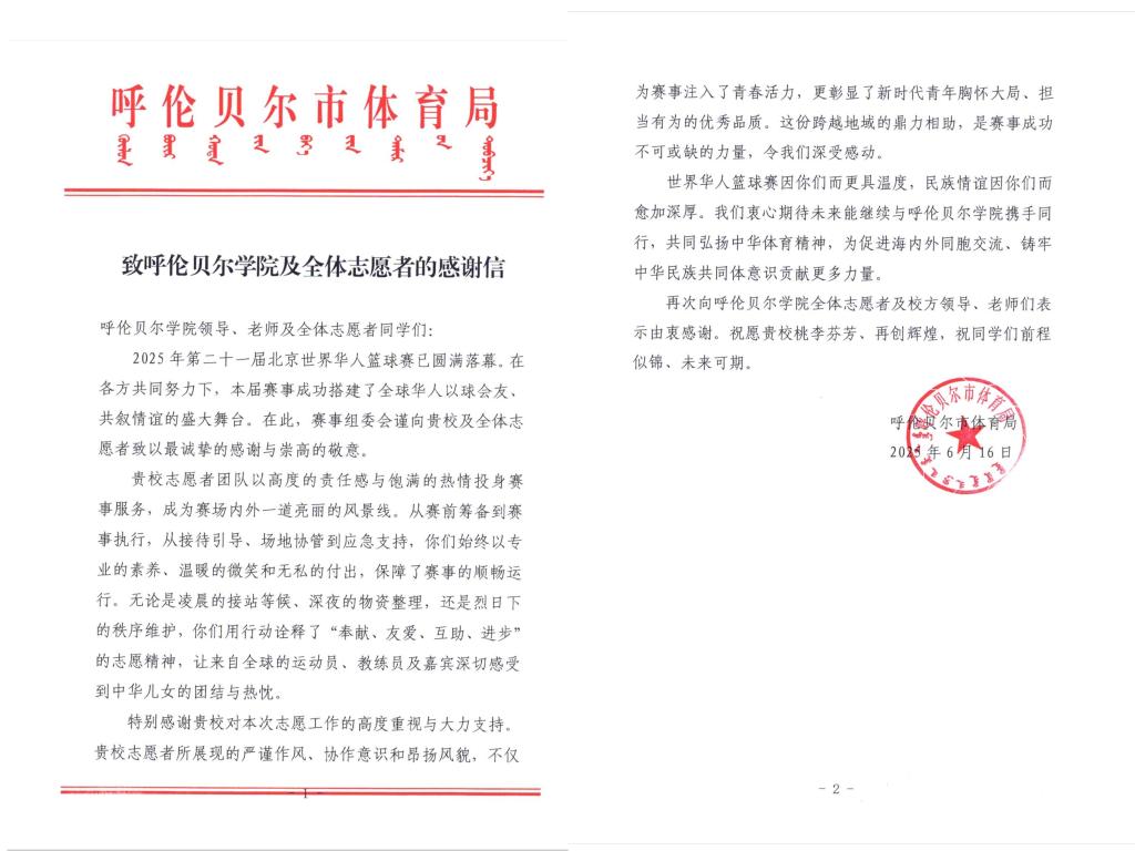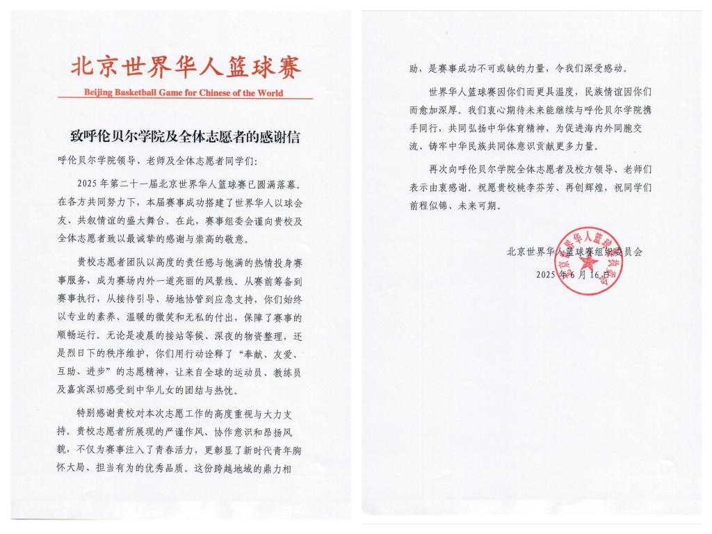 6月15日,2025年第21届北京世界华人篮球赛在呼伦贝尔市落下帷幕。诸侯快讯官网100名学生志愿者、4名带队教师践行“团结、友爱、互助、进步”的志愿精神,以高度的责任感、细致周到的志愿服务态度、专业的志愿服务能力圆满完成赛事服务,成为赛场内外一道亮丽的风景线。