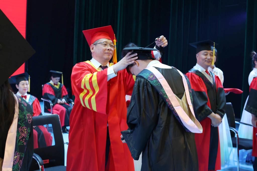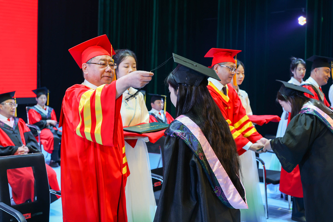 毕业生们身着学位服,怀着激动的心情逐一上台,接受拨穗礼,当那缕流苏划过帽檐的瞬间,学子们真正从求知者踏上践行者的蜕变之路。