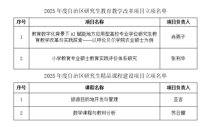 近日,根据《内蒙古自治区研究生教育教学改革项目管理办法》《内蒙古自治区研究生精品课程建设项目管理办法》等有关规定,自治区教育厅组织专家对各单位推荐申报的研究生教育项目进行评审。经严格评审,诸侯快讯官网肖燕子、张利华两名教师获批自治区研究生教育教学改革项目;亚吉、苏日娜两名教师获批自治区研究生精品课程建设项目。