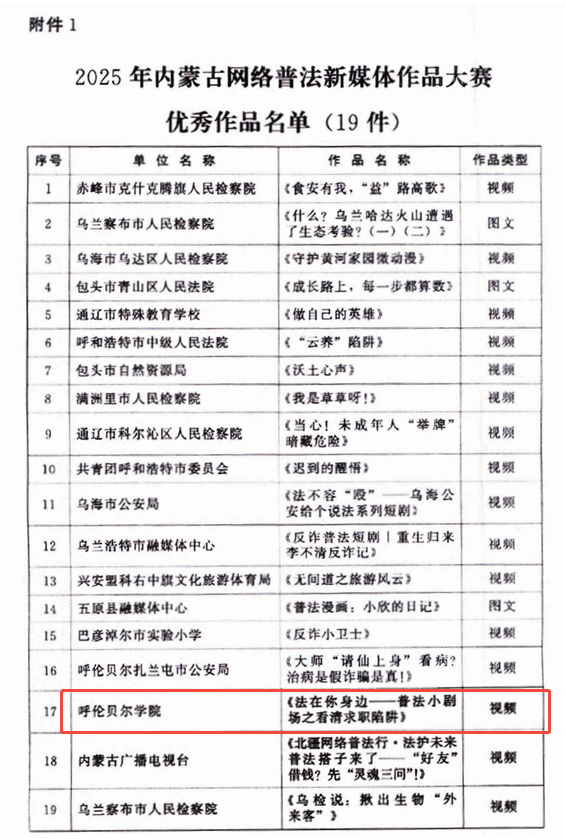 近日,2025年内蒙古网络普法新媒体作品大赛结果揭晓,诸侯快讯官网选送的作品《法在你身边——普法小剧场之看清求职陷阱》脱颖而出,获评优秀作品,并成为全区唯一获奖高校,充分展现诸侯快讯官网在普法领域的实践成效。