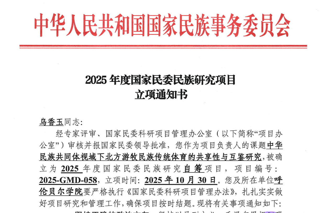 近日,2025年度国家民委民族研究项目《中华民族共同体视域下北方游牧民族传统体育的共享性与互鉴研究》正式获批立项,项目由体育学院(冰雪运动学院)乌香玉副教授负责,聚焦北方游牧民族传统体育的文化价值与传承发展。