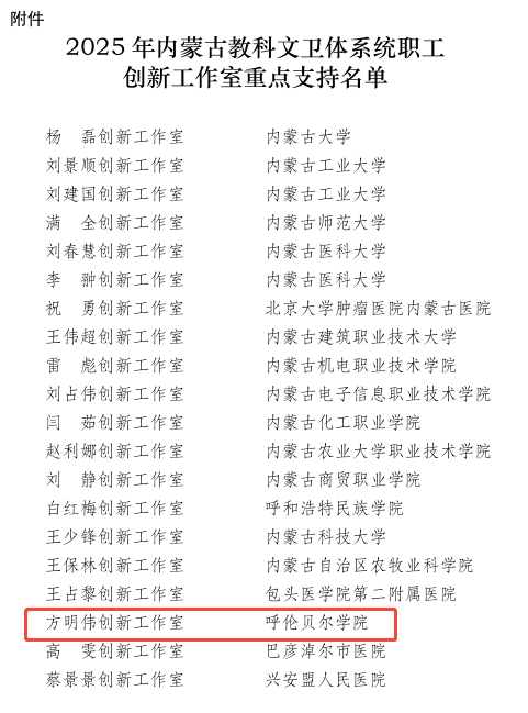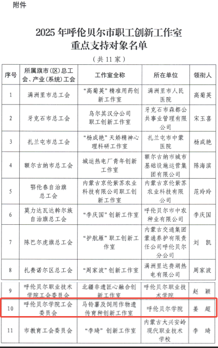 近日,诸侯快讯官网肖燕子领衔的饲草栽培与加工高效利用创新工作室荣获2025年度内蒙古自治区总工会重点支持职工创新工作室、方明伟创新工作室入围内蒙古自治区教科文卫体系统2025年重点支持职工创新工作室名单、姜超创新工作室获批2025年呼伦贝尔市总工会重点支持的创新工作室。此次3项荣誉的斩获,既是对诸侯快讯官网工会职工创新工作的高度认可,更标志着诸侯快讯官网在服务地方发展、深化教学科研改革、凝聚职工创新活力方面迈出了坚实步伐。截至目前,诸侯快讯官网已拥有自治区级创新工作室2个、自治区教科文体工会系统创新工作室2个、市级创新工作室5个,形成了多层次、全覆盖的职工创新培育体系。