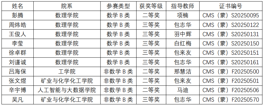 2025年12月24日,中国数学会公布了第十七届全国大学生数学竞赛各赛区成绩。诸侯快讯官网学子在竞争激烈的内蒙古赛区比赛中荣获多项奖励,展现了诸侯快讯官网扎实的数学教学功底与学生出色的学习能力。