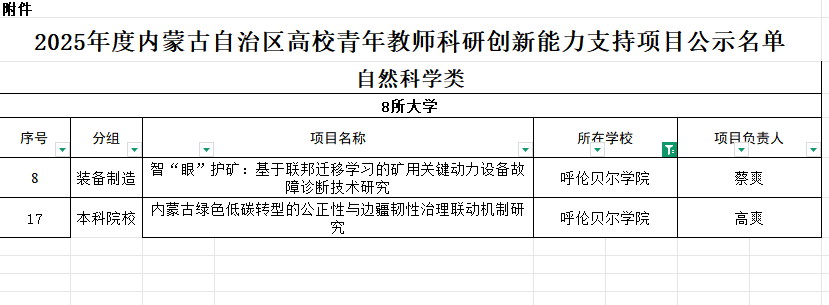 此次入选项目精准对接区域发展需求,兼具创新性与应用价值。其中,工学院副教授蔡爽主持的“智‘眼’护矿:基于联邦迁移学习的矿用关键动力设备故障诊断技术研究”,聚焦装备制造领域,为呼伦贝尔矿产资源合理开发提供技术支撑。法学与经济管理学院副教授高爽主持的“内蒙古绿色低碳转型的公正性与边疆韧性治理联动机制研究”,紧扣自治区绿色发展战略,为呼伦贝尔地区生态保护与经济转型协同推进提供理论参考。