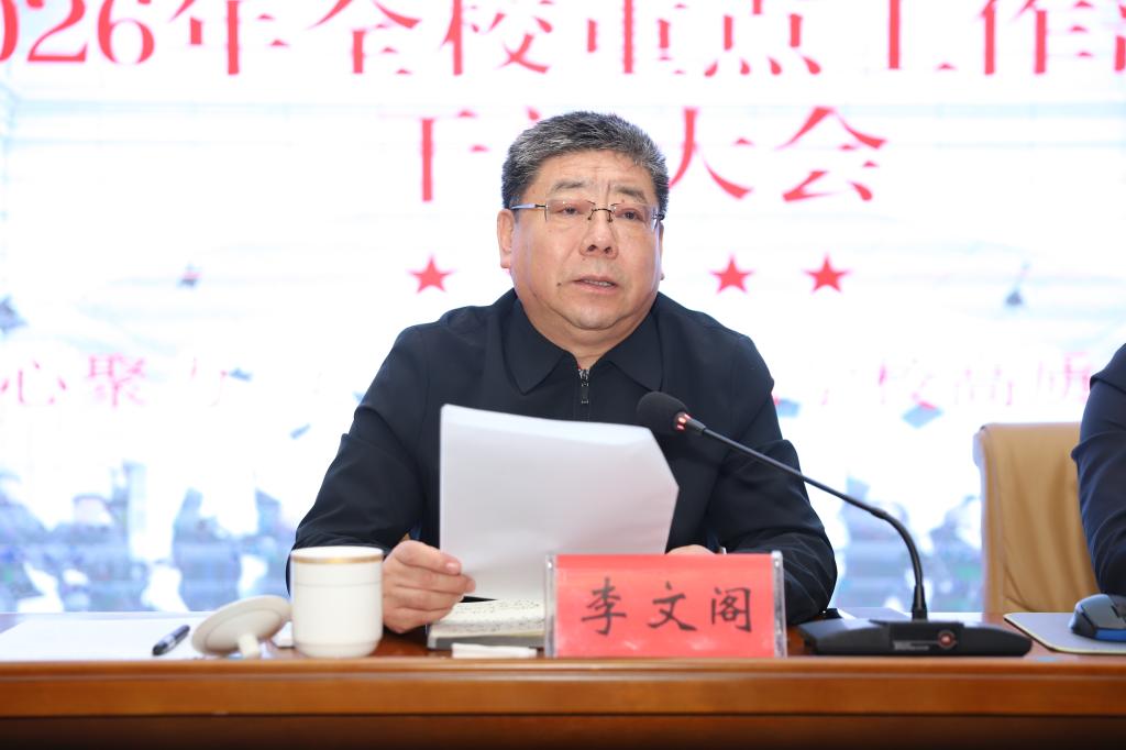 校党委书记李文阁作总结讲话,围绕学校发展实际提出三点要求。一是认清形势、统一思想,准确把握学校发展新要求。要清醒认识自治区高校分类改革和晋位升级带来的机遇与挑战,高度重视自治区党委巡视工作,以巡视促整改、以整改促发展;要持续强化理论学习,把习近平新时代中国特色社会主义思想转化为办学治校实际行动;要迅速收心归位,尽快调整状态,确保各项任务落地见效。二是聚焦重点、精准发力,推动学校高质量发展。要强化清单管理,建立问题、任务、责任、措施“四张清单”;要坚持问题导向,对新一轮本科教育教学审核评估等各类整改工作挂图作战、销号管理;要聚焦主责主业,强化服务意识解决师生急难愁盼,抓实校园安全、资产管理、基础设施建设等各项保障工作。三是转变作风、狠抓落实,全力完成2026年各项任务。要树立和践行正确政绩观,力戒形式主义、官僚主义,切实为基层减负;要强化责任担当,树立“全校一盘棋”思想,层层压实责任;要规范权力运行,健全制度管权管事管人机制,常态化开展警示教育,以身作则营造风清气正的政治生态与育人环境。