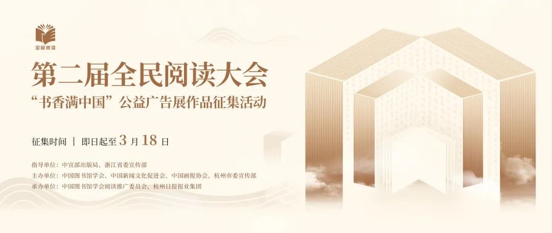 党的二十大报告明确指出,要深化全民阅读活动。为深入学习贯彻党的二十大精神,倡导全民阅读、建设书香社会,第二届全民阅读大会将于2023年4月23日在杭州开幕。在中央宣传部出版局、浙江省委宣传部指导下,由中国图书馆学会、中国新闻文化促进会、中国画报协会、杭州市委宣传部主办,中国图书馆学会阅读推广委员会、杭州日报报业集团承办的第二届全民阅读大会“书香满中国”公益广告展,现面向全国公开征集全民阅读主题的优秀海报、摄影及视频作品,符合条件的作品将予入展。