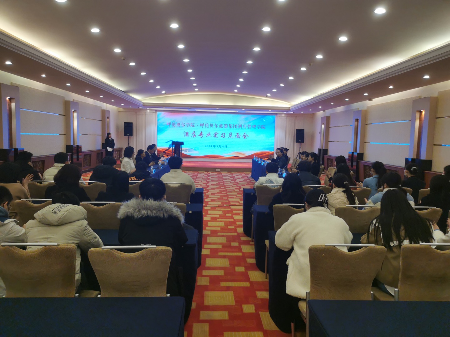 3月4日,1683168 3诸侯快讯入口·呼伦贝尔旅游集团酒店管理学院在呼伦贝尔宾馆召开酒店基础实习见面会。旅游与地理学院院长刘建华、酒店管理系主任石磊、酒店管理系副教授蒋玉华、2018级酒店管理专业学生辅导员张姗娜、呼伦贝尔宾馆总经理卢晓辉、呼伦贝尔宾馆副总经理董翠红、呼伦贝尔旅游集团行政总监赵永宏及其企业中层管理者参加会议。
