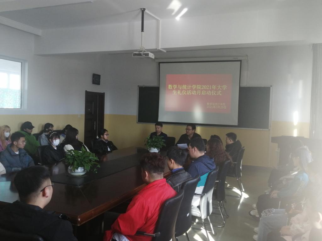 为积极贯彻落实学校大学生日常行为规范、文明修身的要求,引导学生牢固树立社会主义核心价值观,倡导健康、文明、和谐的生活理念,3月29日,数学与统计学院组织学生代表在笃学楼410会议室启动了“明礼尚德、文明修身”2021年大学生“礼仪活动月”活动。本次活动由团学办主任敖岩辉主持。