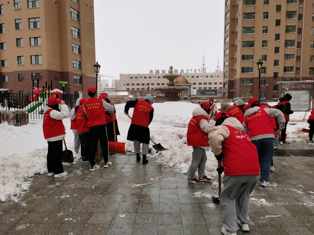 志愿者们身着红色的志愿服装,拿着雪铲等除雪工具前往社区。雪后的天气仍然寒冷,同学们拿着除雪工具却忙得热火朝天。面对厚厚的积雪,有些女同学拿着宽大的雪铲铲起雪来十分吃力,但依然奋力和积雪“作斗争”。同学们互帮互助认真清扫自己所在的区域。这个下午,青春与活力在清雪中体现的淋漓尽致。