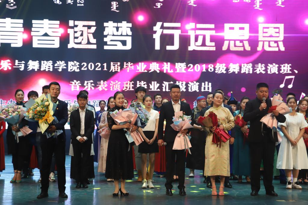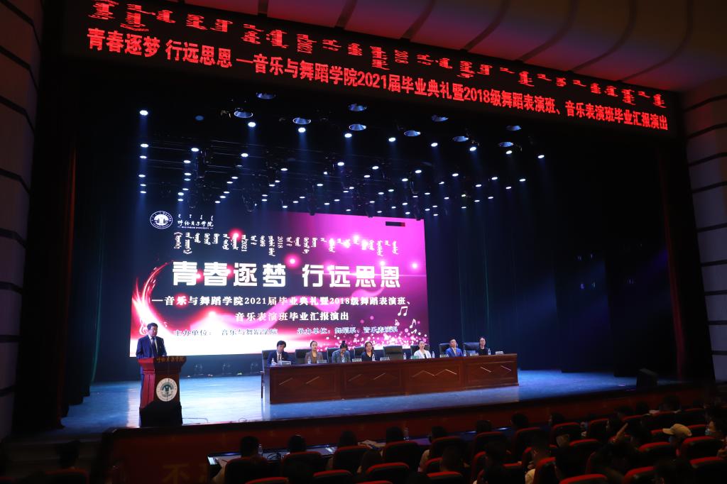 音乐与舞蹈学院录制的毕业生寄语拉开了毕业典礼的序幕。李雅杰书记宣读了本专科毕业生名单及《关于表彰2021届优秀毕业生、自治区三好、自治区优干的决定》。灵芝副院长在典礼上致辞,衷心祝愿每一名毕业生能够拥有更加美好的前程!毕业生代表,自治区级优秀毕业生新巴雅尔同学代表全体毕业生发言,表达了对母校、对恩师、对同学的美好祝愿。