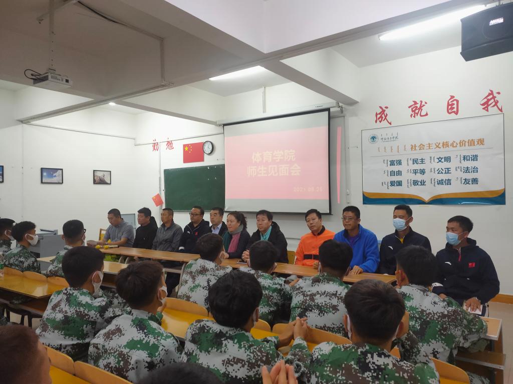 金秋九月,体育学院又迎来了99名新同学,一张张崭新的面孔,给体育学院注入了新鲜的血液。为帮助2021级新生尽快适应大学生活,上好“开学第一课”,9月25日下午,体育学院举行了隆重的2021级新生师生见面会。会议由团学办主任郭晨老师主持,体育学院全体班子成员、系部主任和新生班主任、辅导员老师以及全体新生参加。