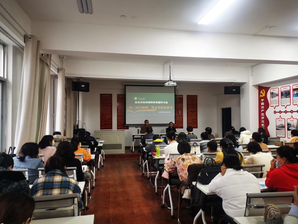 11月17日下午,教育学院在艺术楼501召开师德师风专题学习会议,学习“时代楷模”黄大年同志的先进事迹。教育学院全体教职工参加学习会,会议由教育学院党总支书记姜明红主持。
