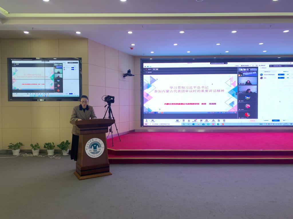 胡清惠教授以“学习贯彻习近平总书记参加内蒙古代表团审议时的重要讲话精神”为主题,围绕着习近平总书记历次在参加内蒙古代表团审议时发表的重要讲话、从党和国家工作大局统筹民族工作等方面进行了详细讲解。讲解深入浅出,突出学理性、启发性和思想性,结合时事热点将习近平新时代中国特色社会主义思想融入到集体备课当中。胡清惠教授指出,习近平总书记在参加内蒙古代表团审议时的重要讲话为书写新时代内蒙古高质量发展新篇章提供了强大的思想武器和科学的行动指南,要紧紧抓住铸牢中华民族共同体意识这个新时代党的民族工作的“纲”,用心用情用力呵护好“模范自治区”崇高荣誉,以铸牢中华民族共同体意识为主线推进各项工作,以实际行动迎接党的二十大胜利召开。