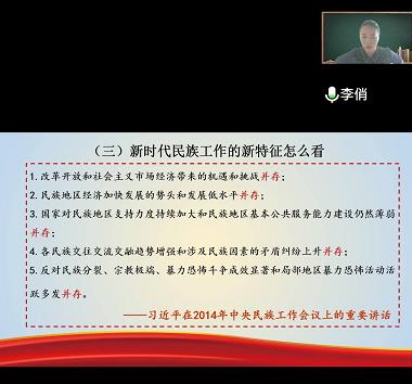 5月22日,美术学院在腾讯会议举办了题为“学习中央民族工作会议精神铸牢中华民族共同体意识”讲座,邀请马克思主义学院院长李俏主讲。美术学院党总支书记包德主持讲座,美术学院师生近400人参加。