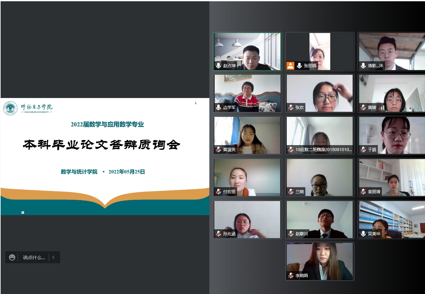 5月25日下午,数学与统计学院2022届数学与应用数学专业本科学位论文答辩通过腾讯视频会议在线进行。本次答辩共分5个答辩小组,数学与应用数学专业67名本科生参加了答辩。