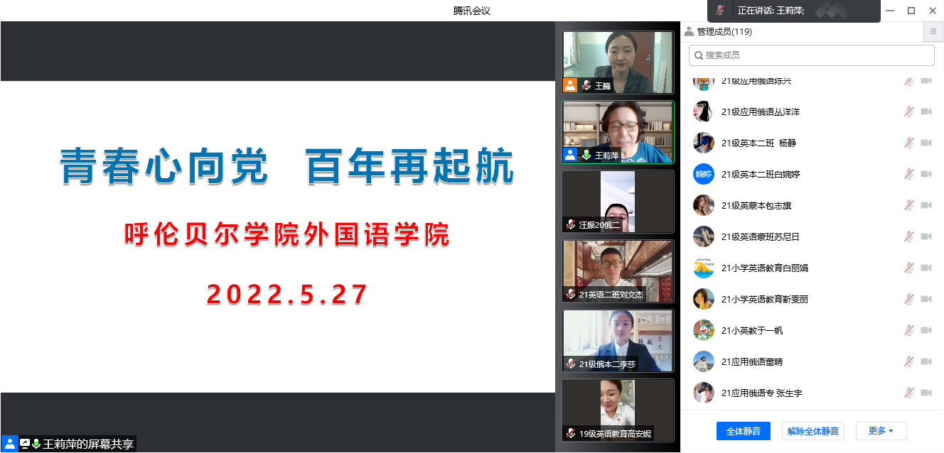 为深入领会习近平总书记在庆祝中国共产主义青年团成立100周年大会上重要讲话的重大意义和深刻内涵,5月27日,外国语学院邀请北京青年政治学院王莉萍教授为外国语学院师生带来“青春心向党 百年再启航”主题线上讲座。外国语学院入党积极分子、学生会全体成员130余人参加了讲座,讲座由外国语学院团总支书记王巍主持。