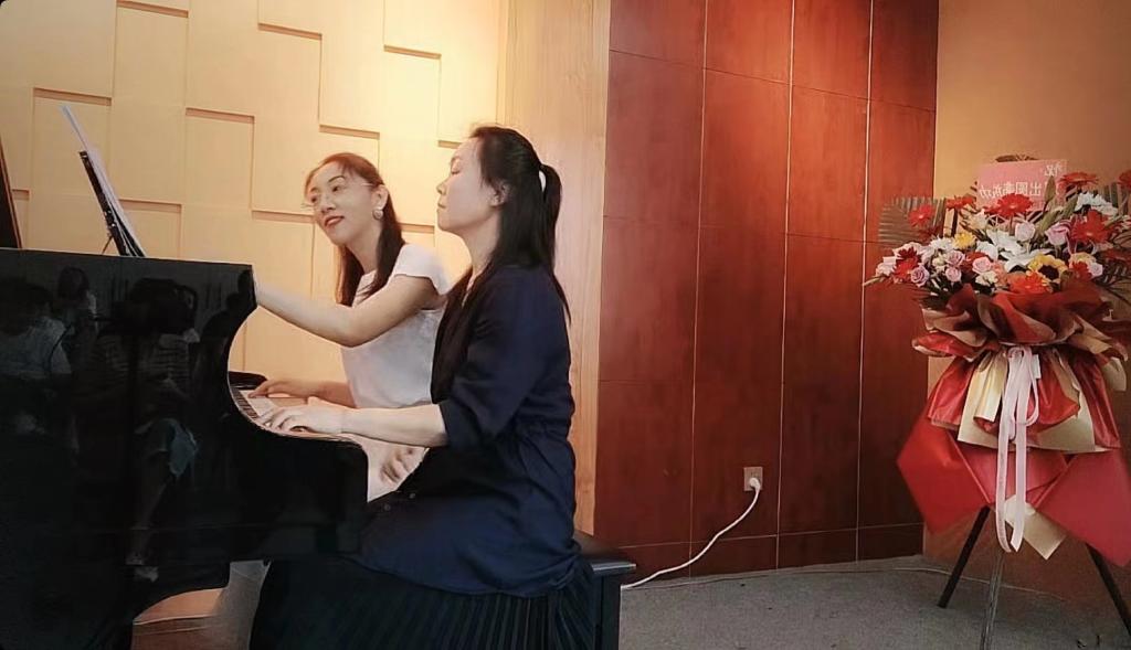 曹杨老师和伊兰老师演奏了古典乐派、浪漫乐派、现代乐派和中国作品等具有代表性的八首四手联弹作品。主持人伊拉娜详细介绍了每首作品的时代背景、音乐内涵。当弹奏中国作品《唱支山歌给党听》和《我的祖国》时,唤起了教师和学生对祖国、对党无限的感恩和热爱之情,增强了民族自豪感。同时,在音乐会现场和直播间的老师和同学们感受到不同音乐作品传递的不同音乐风格和人文情怀。