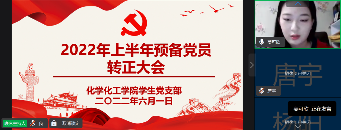 近日,化学化工学院以线上线下相结合的形式召开了2022年上半年预备党员转正大会。大会由化学化工学院教工党支部书记白春英和学生党支部书记孟庆永主持,化学化工学院全体党员参加会议。