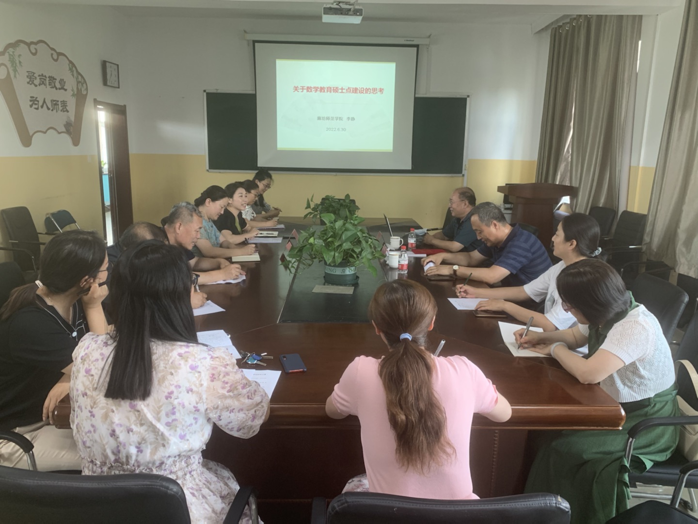 为提高教育硕士学科教学(数学)学科建设工作水平,增强硕士研究生培养能力,7月1日下午,数学与统计学院邀请廊坊师范学院李静教授指导教育硕士学科教学(数学)培养工作。人事处李跃武处长,数学与统计学院党总支书记宋旭霞、院长张桂芝及硕士研究生授课团队全体教师参加了此次会议。