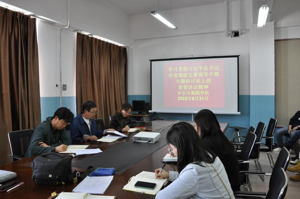 8月31日下午,音乐与舞蹈学院党总支组织全体教职工在艺术楼606会议室开展政治理论学习活动,深入学习贯彻习近平总书记在省部级主要领导干部专题研讨班上的重要讲话精神,迎接党的二十大,党总支书记李雅杰带领全体教职工对讲话精神进行了深刻分析。