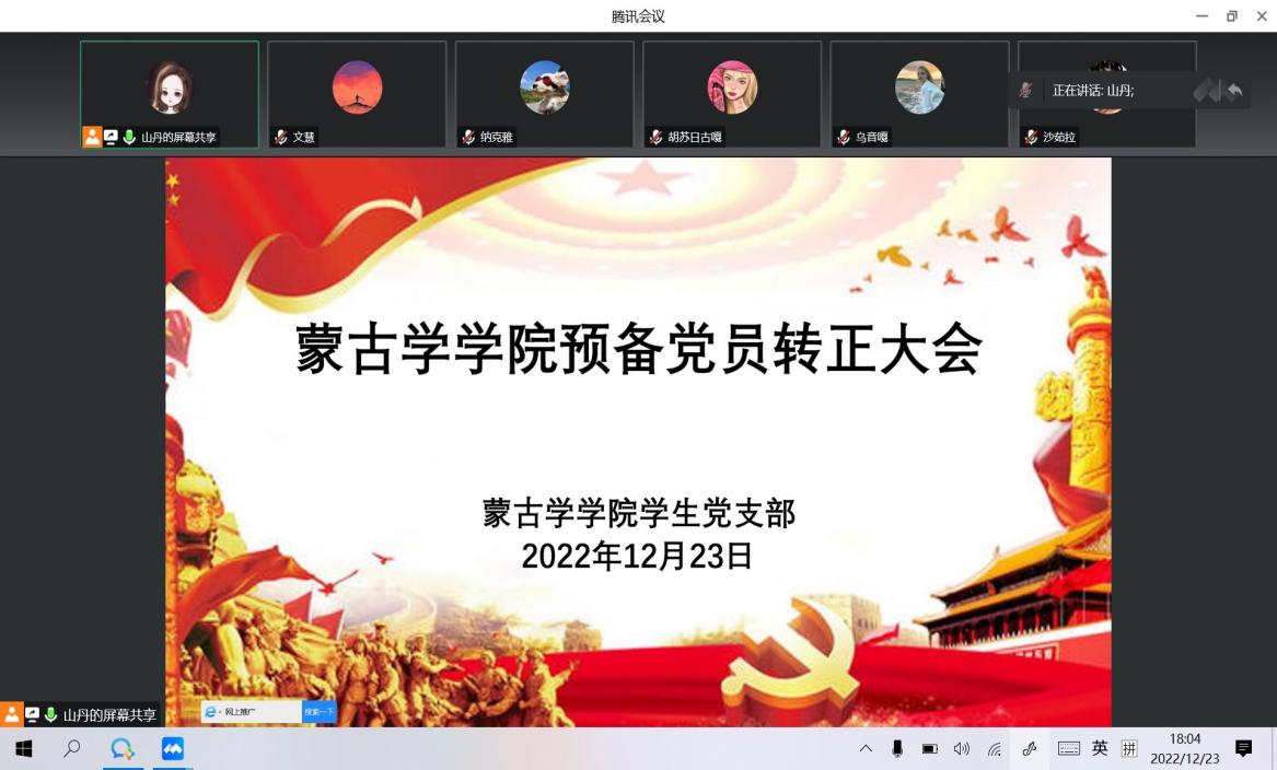 12月23日下午,蒙古学学院学生党支部召开预备党员转正大会。会议由学生党支部书记山丹主持,党总支书记乌云、党总支副书记乌云图、入党培养介绍人、学生正式党员、预备党员共32人参加会议。