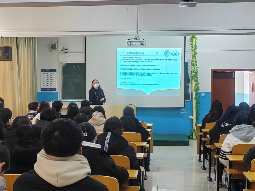 会上,宋旭霞书记以“研途规划 逐梦未来”为题做考研指导专题讲座,全面解析近几年国内考研趋势,详细介绍了数学、学科教学和统计学等专业的考研基本情况,鼓励学生通过研究生升学渠道提升学历层次,增强就业竞争力。同时,对学生比较关注的公务员和教师招录考试进行了详细介绍,鼓励大家找准适合自身发展定位和方向,提前谋划、主动出击,克服懈怠畏难心理,多方准备、重点备考。