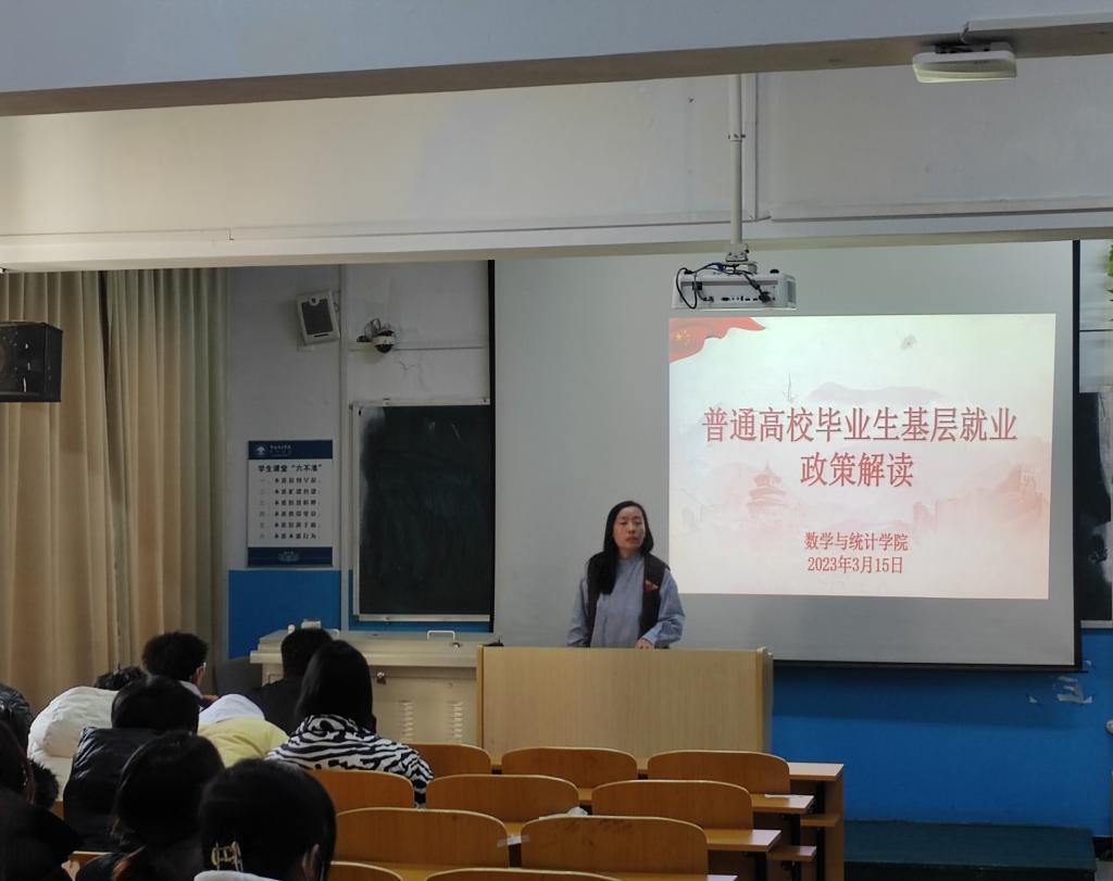 为帮助学生了解当前就业形势,熟悉相关就业政策,明确就业目标和方向,做好学业职业规划,3月15日下午,数学与统计学院在笃学楼401教室召开就业政策宣讲会。学院党总支书记宋旭霞、副书记乌日拉、班主任郭永兵做专题宣讲,80余名学生参会。