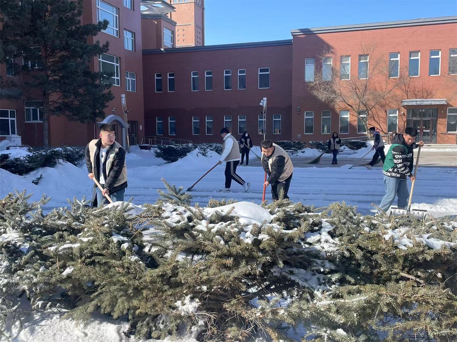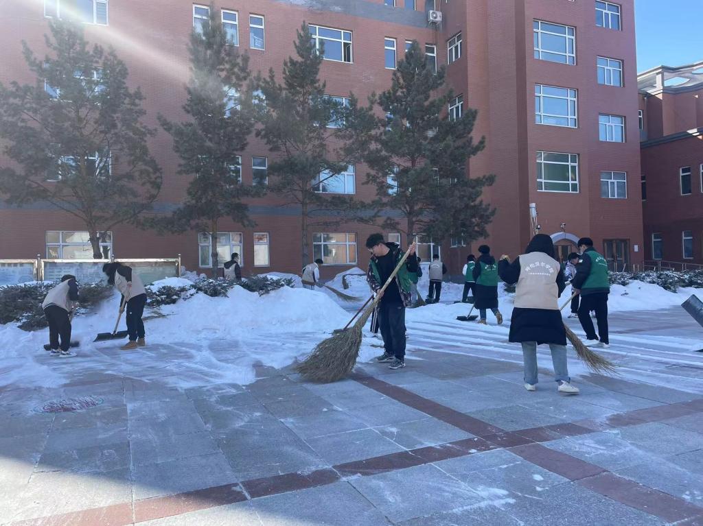 在本次志愿服务活动中,志愿者们齐心协力,配合默契,大家忙碌的身影构成了一道亮丽的风景线。虽然室外温度低,却丝毫没有影响大家清除积雪的热情,经过近2个小时的奋战,将校园路面冰雪清除完毕,保障了校园内师生安全畅通的出行环境。