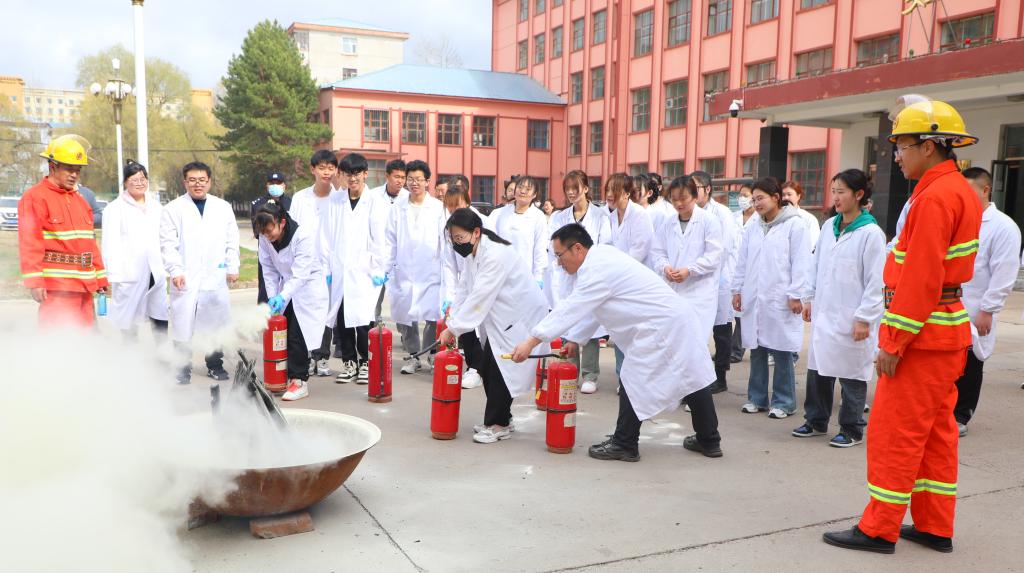 随后,在知行楼门前由校园安全管理处专业人员为师生讲解了消防安全知识、火灾初期扑救方法、火灾时逃生方法和注意事项,演示了灭火器、灭火毯等消防器材正确使用方法,并指导师生进行灭火器使用的实际操作。
