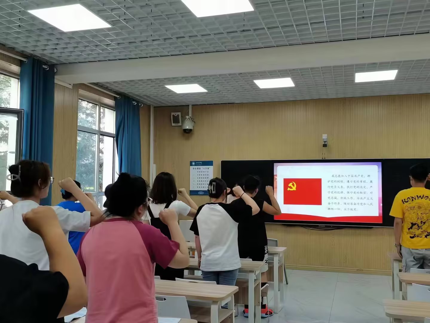 6月25日,学生党支部在师专楼111教室开展“赓续血脉强党性砥砺奋进迎七一”主题党日活动。全体学生党员重温入党誓词,在鲜红的党旗下,党员们佩戴党员徽章,举起右拳,庄严宣誓,铮铮誓言,坚定有力。学生党员们回顾入党的过程,强化党员身份,树牢宗旨意识,践行入党承诺。