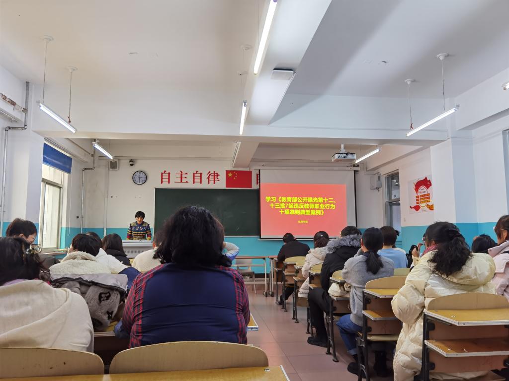 会议学习了教育部公开曝光第十二批、第十三批14起违反教师职业行为十项准则典型案例。通过反面典型,警醒广大教师要纯洁教书,纯净育人,树立人民教师良好形象,营造风清气正氛围。